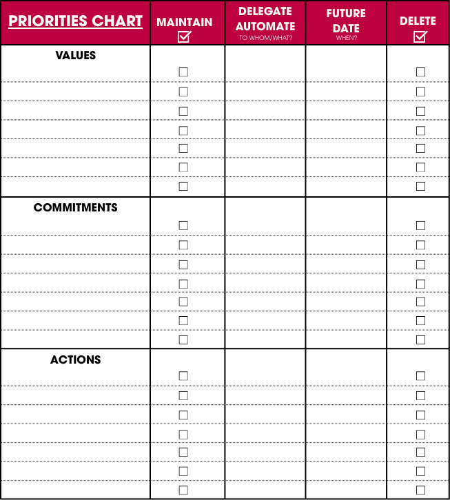Create a simple sorting structure for your Values, Commitments, Actions like the PRIORITIES CHART here: